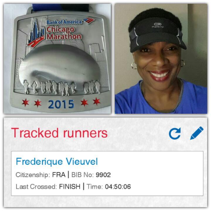 Notre Fred internationale était du côté de Chicago (alias The Windy City qui une fois de plus n'a pas volé son surnom) avec en prime une temperature plutôt élévée pour la saison. Malgré tout ça, elle a décroché sa 2ème étoile après celle de Londres en réalisant un beau chrono en 4h50mn06s avec une belle accélération sur les 2 derniers km. Ses temps de passage sont disponibles ici.